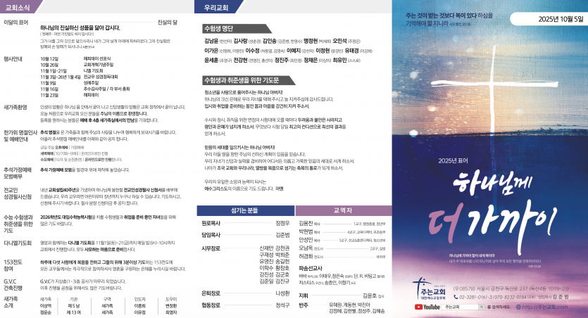 25-10-05 페이지 정보 작성자 주는교회 댓글 0건 조회 96회 작성일 25-10-04 10:55 목록 본문 이전글25-10-12 25.10.10 다음글25-09-28 25.09.27 댓글 0 댓글목록 등록된 댓글이 없습니다.