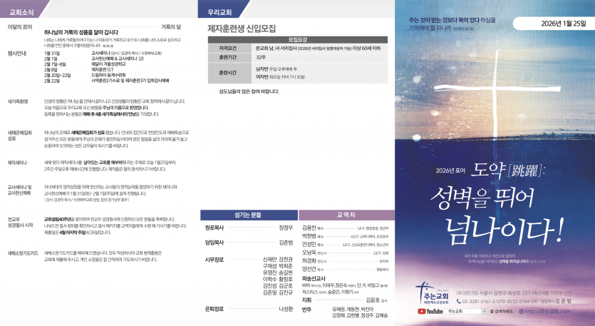 26-01-25 페이지 정보 작성자 주는교회 댓글 0건 조회 51회 작성일 26-01-24 13:32 목록 본문 다음글26-01-18 26.01.16 댓글 0 댓글목록 등록된 댓글이 없습니다.